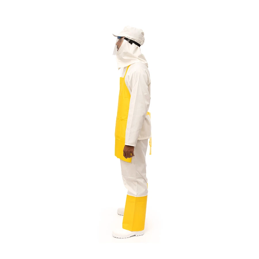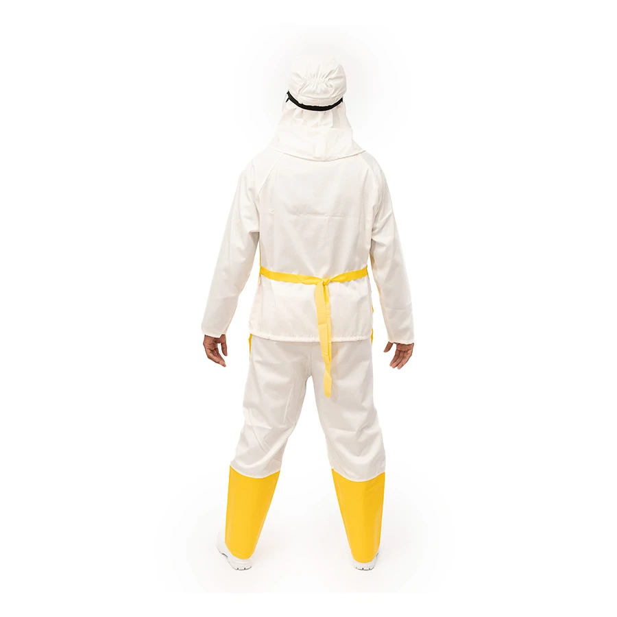 Confeccionado em tecido misto cretone com tratamento hidrorrepelente, 60% algodão e 40% poliéster, com gola padre, de vestir pela cabeça, com fechamento do patê em velcro, mangas compridas e ajuste em cordão na barra do blusão. Acompanhado de boné tipo árabe.