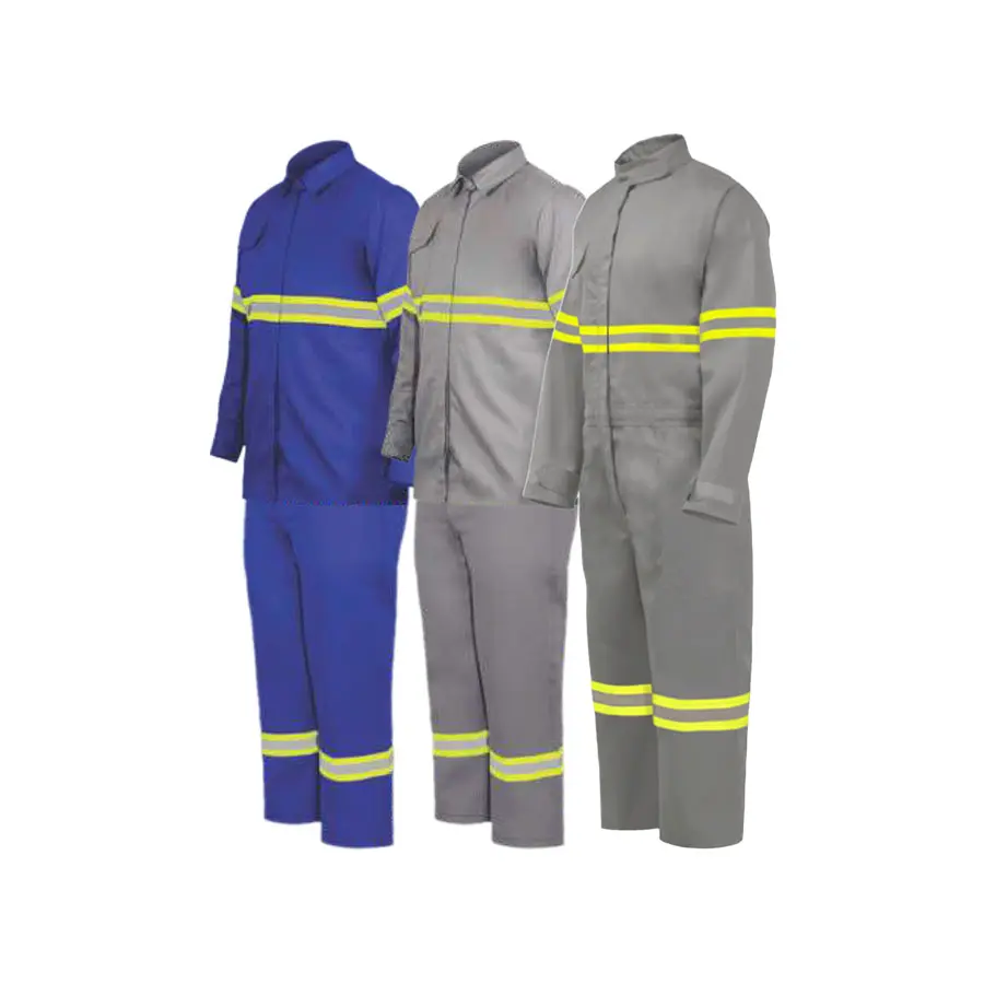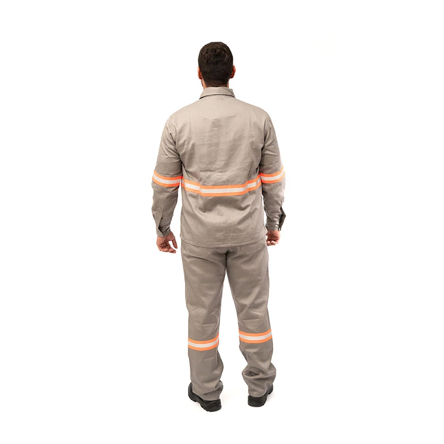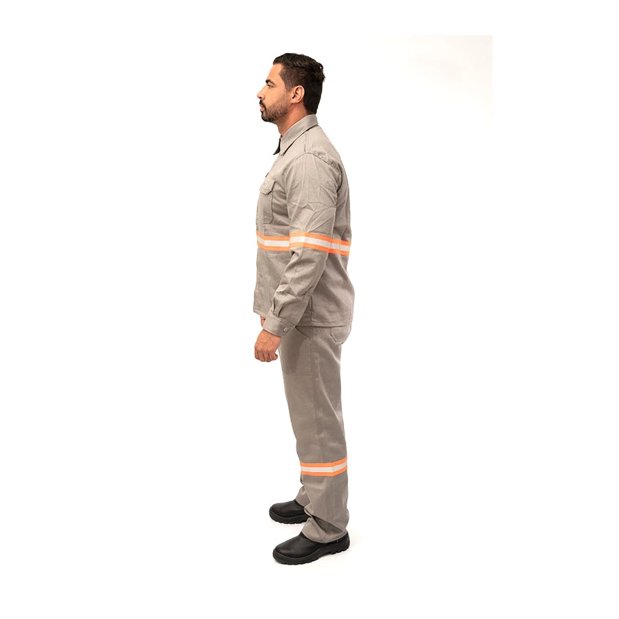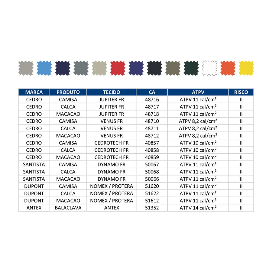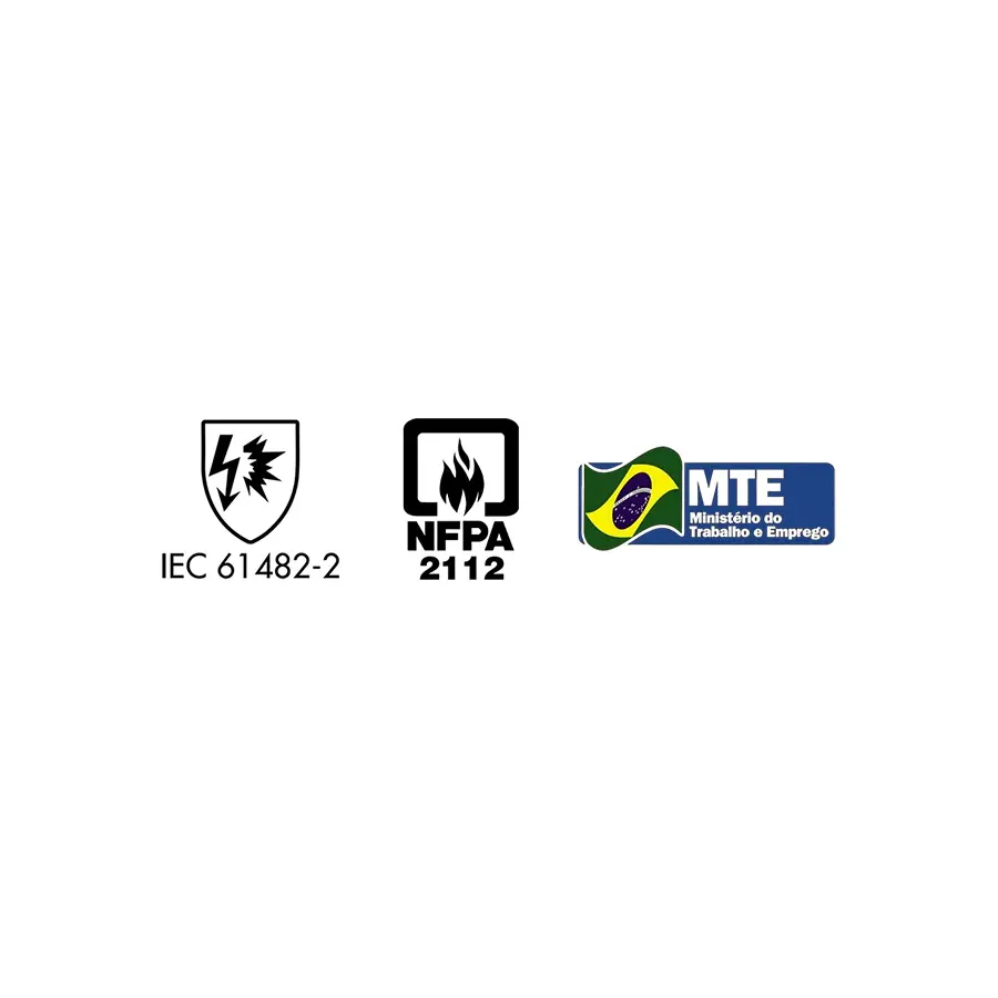 Camisa e calça de segurança confeccionada em uma camada de tecido retardante a chamas FR. Aprovadas para proteção do tronco e membros superiores do usuário contra queimaduras térmicas provenientes de arco elétrico e fogo repentino.