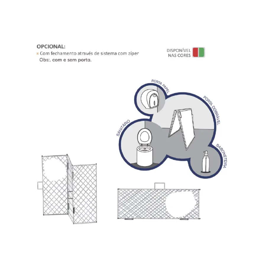 Piso em aço gradeado para fácil limpeza, estrutura fabricada em tubos de aço galvanizado, revestimento em lona de PVC de alta resistência dupla face de fácil higienização, sanitário em chapa de aço com assento e tampa, porta de acesso (dobrável) para maior privacidade, acompanha ganchos e cordas e cordas para fixação da estrutura ao chão, lavatório e kit de higienização com reservatório de água com capacidade para 10 ou 20 L, pá e porta cal para melhor higienização do vaso sanitário, janelas laterais para ventilação e luminosidade, bolsa para transporte, identificação (masculino e feminino).