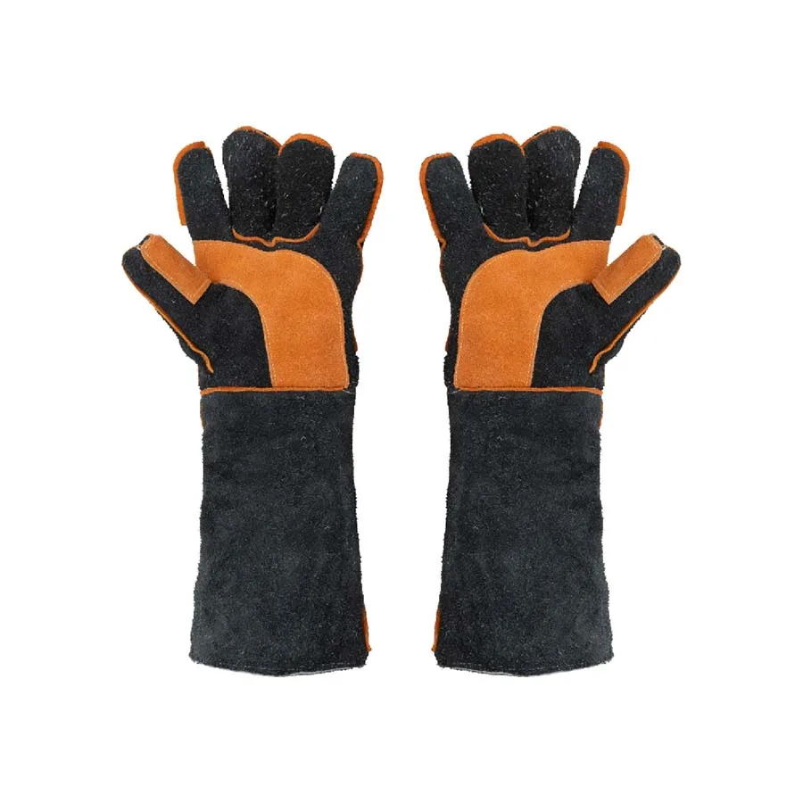 Luva de segurança confeccionada em raspa (preta) com tratamento isolante térmico, reforço meia lua no punho, tira de reforço externo e entre os dedos polegar e indicador, forração em manta térmica, contra forro em lona industrial felpada e costuras em linhas de algodão ou aramida. Punho tamanho: 20cm.