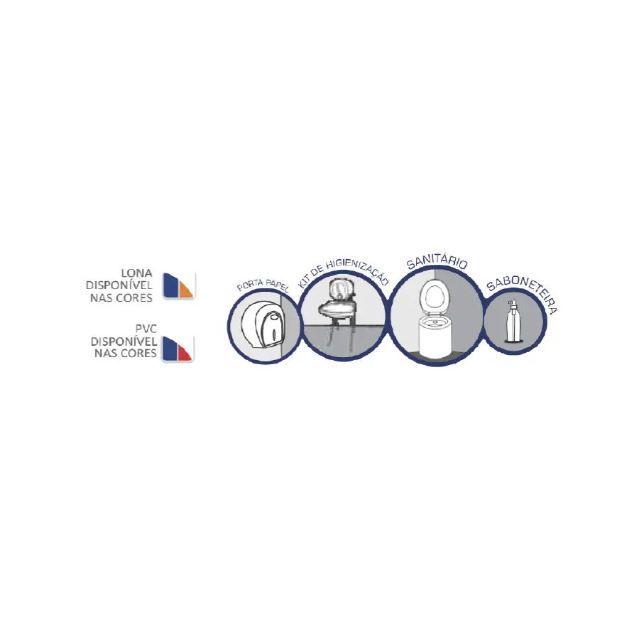 Piso em aço gradeado ou borracha (dobrável), estrutura fabricada em tubos de aço galvanizado, revestimento em lona de PVC ou lona leve, sanitário em chapa de aço com assento e tampa, fechamento em velcro, encaixes simples e ganchos para fixação da estrutura ao chão, lavatório e kit de higienização com reservatório de água com capacidade para 10 ou 20 L, janelas laterias para ventilação e luminosidade, bolsa para transporte, identificação (masculino e feminino).